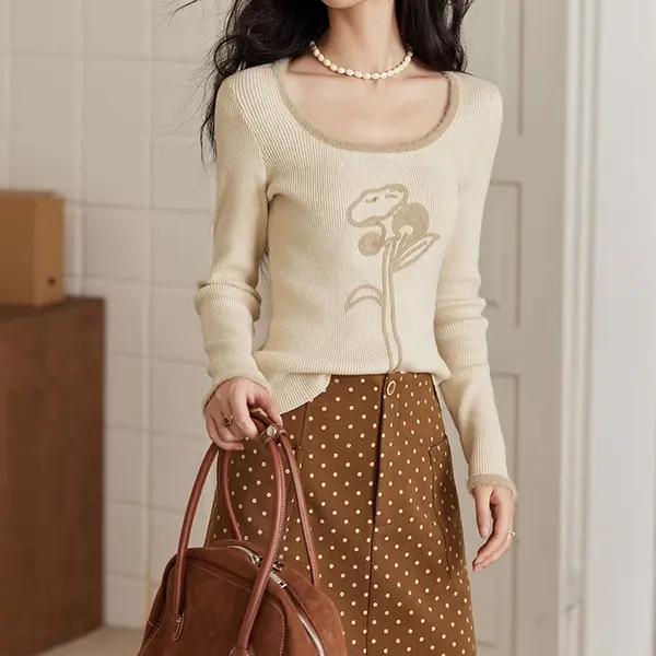 Suéter de mujer con cuello en U y flores bordadas - Top de punto retro otoño-invierno 2024