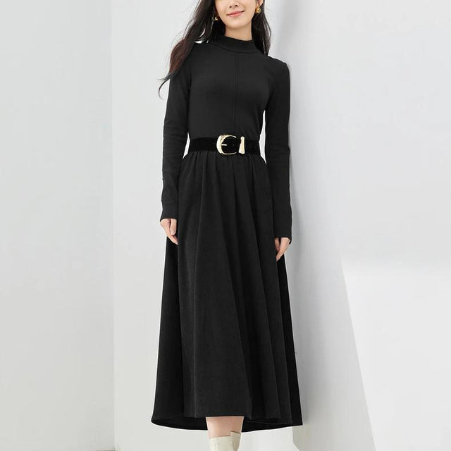 Vestido de pana negro de cuello medio alto y manga larga de invierno para mujer - SG / Negro está agotado y se enviará tan pronto como vuelva a estar disponible.