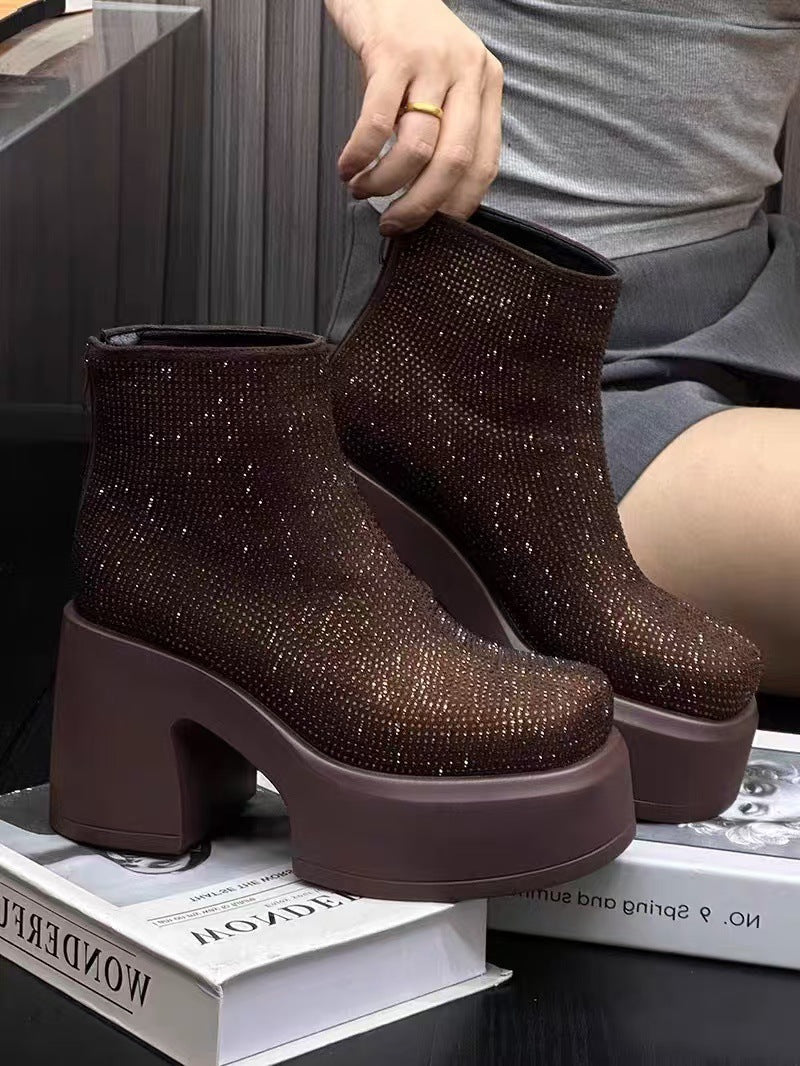 Botines de tacón grueso con plataforma y diamantes de imitación estrellados