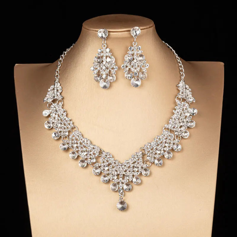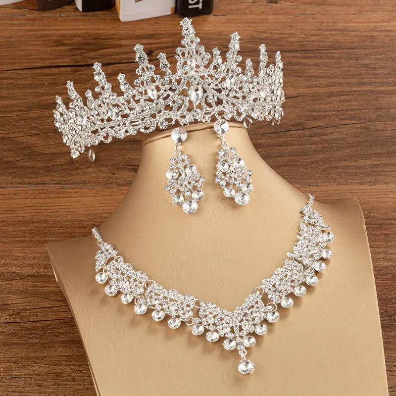 Realza tu atuendo de novia con este espectacular conjunto de joyas de cristal. Diseñado para exudar lujo y elegancia, este conjunto te hará sentir como la realeza. Desde la gargantilla de cristal que enmarca elegantemente tu escote hasta los pendientes de gota de agua que añaden brillo a cada paso, este conjunto es tu compañero perfecto para cualquier evento en el que el glamour sea esencial. Haga que el día de su boda sea tan inolvidable como usted: agregue este lujoso conjunto de joyas nupciales de cristal a su colección hoy y sea el centro de atención con confianza y gracia.