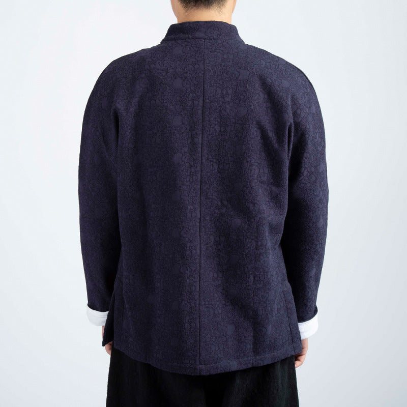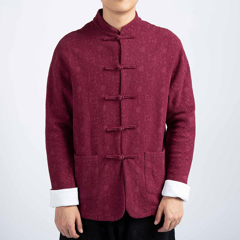 Chaqueta de traje estilo chino de algodón y lino con cuello en V y jacquard grueso para hombre