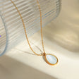 Our pendant necklace features a stunning opal inlaid design, set within high-quality stainless steel and adorned with a lustrous 18K gold plating. This fusion of premium materials ensures lasting durability and resistance to tarnishing, making it a cherished addition to your jewelry collection for years to come.A Versatile Statement Piece